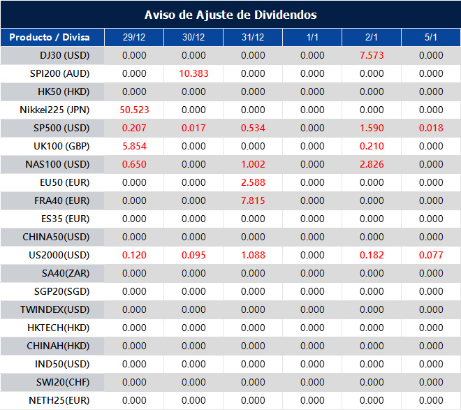 Tenga en cuenta que los dividendos de los siguientes productos se ajustarán en consecuencia. Los dividendos de los índices se ejecutarán por separado a través de un extracto de saldo directamente en su cuenta de trading, y el comentario tendrá el siguiente formato: “Div & Nombre del Producto & Volumen Neto”.