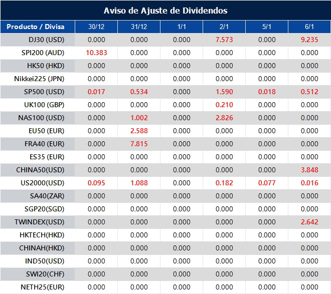 Tenga en cuenta que los dividendos de los siguientes productos se ajustarán en consecuencia. Los dividendos de los índices se ejecutarán por separado a través de un extracto de saldo directamente en su cuenta de trading, y el comentario tendrá el siguiente formato: “Div & Nombre del Producto & Volumen Neto”.