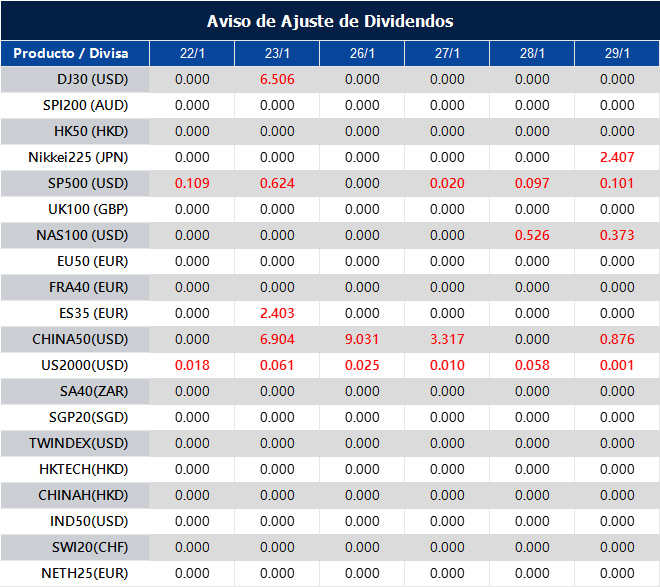 Tenga en cuenta que los dividendos de los siguientes productos se ajustarán en consecuencia. Los dividendos de los índices se ejecutarán por separado a través de un extracto de saldo directamente en su cuenta de trading, y el comentario tendrá el siguiente formato: “Div & Nombre del Producto & Volumen Neto”.