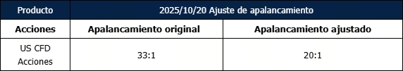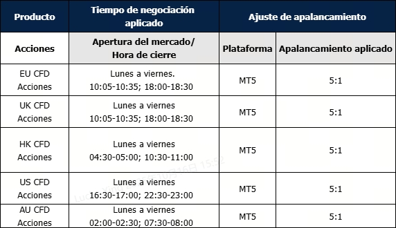 1. Todas las especificaciones para CFD sobre acciones permanecen iguales excepto el apalancamiento durante el período mencionado.
