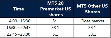 2. 20 Pre-market US Shares on MT5: Leverage will be 5:1 during 14:00-16:30 and 22:45-23:00; and remain 33:1 during the rest of the trading time.